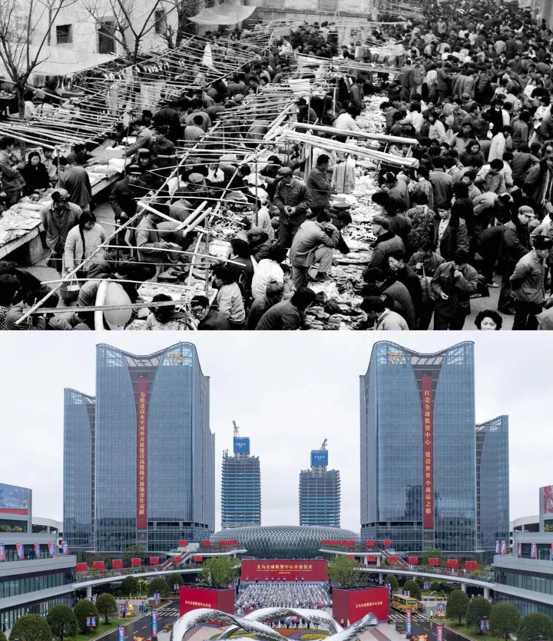 义乌第一代市场(上图)与第六代全球数贸中心(下图)对比 图源:潮新闻客户端