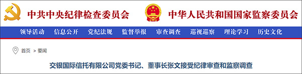 据中央纪委国家监委网站4月23日消息,据中央纪委国家监委驻交通银行纪检监察组、上海市纪委监委消息:交银国际信托有限公司党委书记、董事长张文涉嫌严重违纪违法,目前正接受中央纪委国家监委驻交通银行纪检监察组纪律审查和上海市监察委员会监察调查。