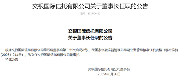 2025年3月,交银国际信托召开董事会、股东会,选举张文担任公司董事长。同年6月,湖北金融监管局核准张文交银国际信托有限公司董事长的任职资格。